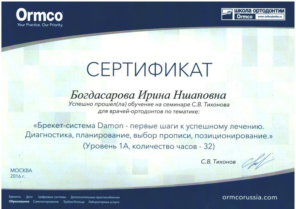 2017 - "Школа ортодонтии (1, 2, 3 уровень)", Ormco Тихонов С.В. Тихонов А.В.