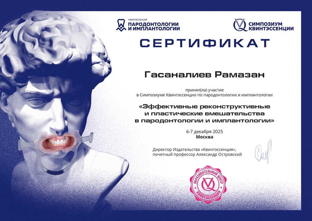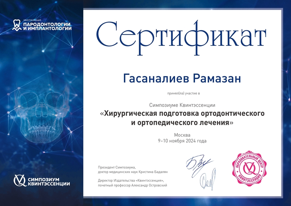 - 2019 - Ординатура по специальности стоматология хирургическая, Российская медицинская академия непрерывного профессионального образования
